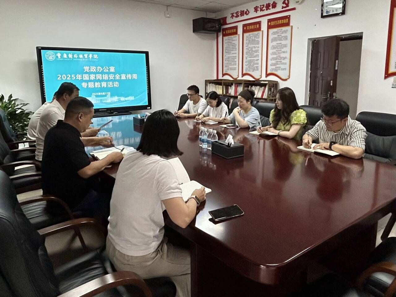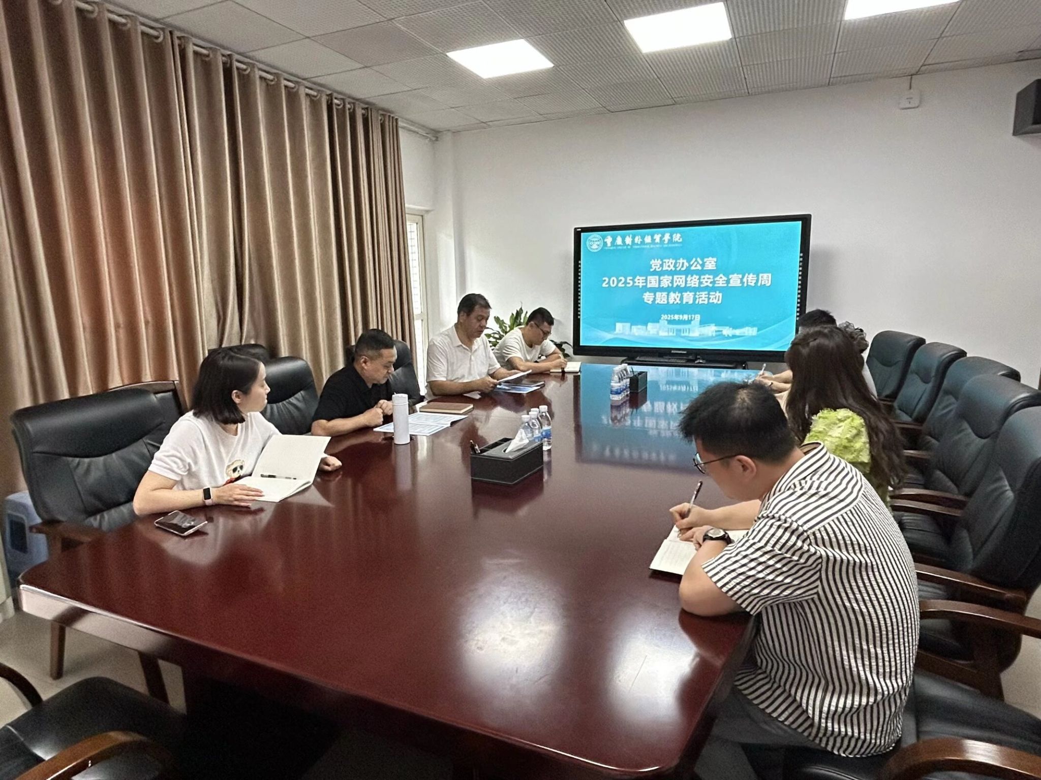 为深入贯彻习近平总书记关于网络强国的重要思想,积极响应国家网络安全宣传周活动,党政办公室于9月17召开了2025年国家网络安全宣传周专题教育会。此次会议围绕“网络安全为人民,网络安全靠人民—以高水平安全守护高质量发展”的主题,旨在增强办公室人员的网络安全意识,提升网络安全防护技能,营造安全、健康、文明的校园网络环境,办公室全体成员参会。