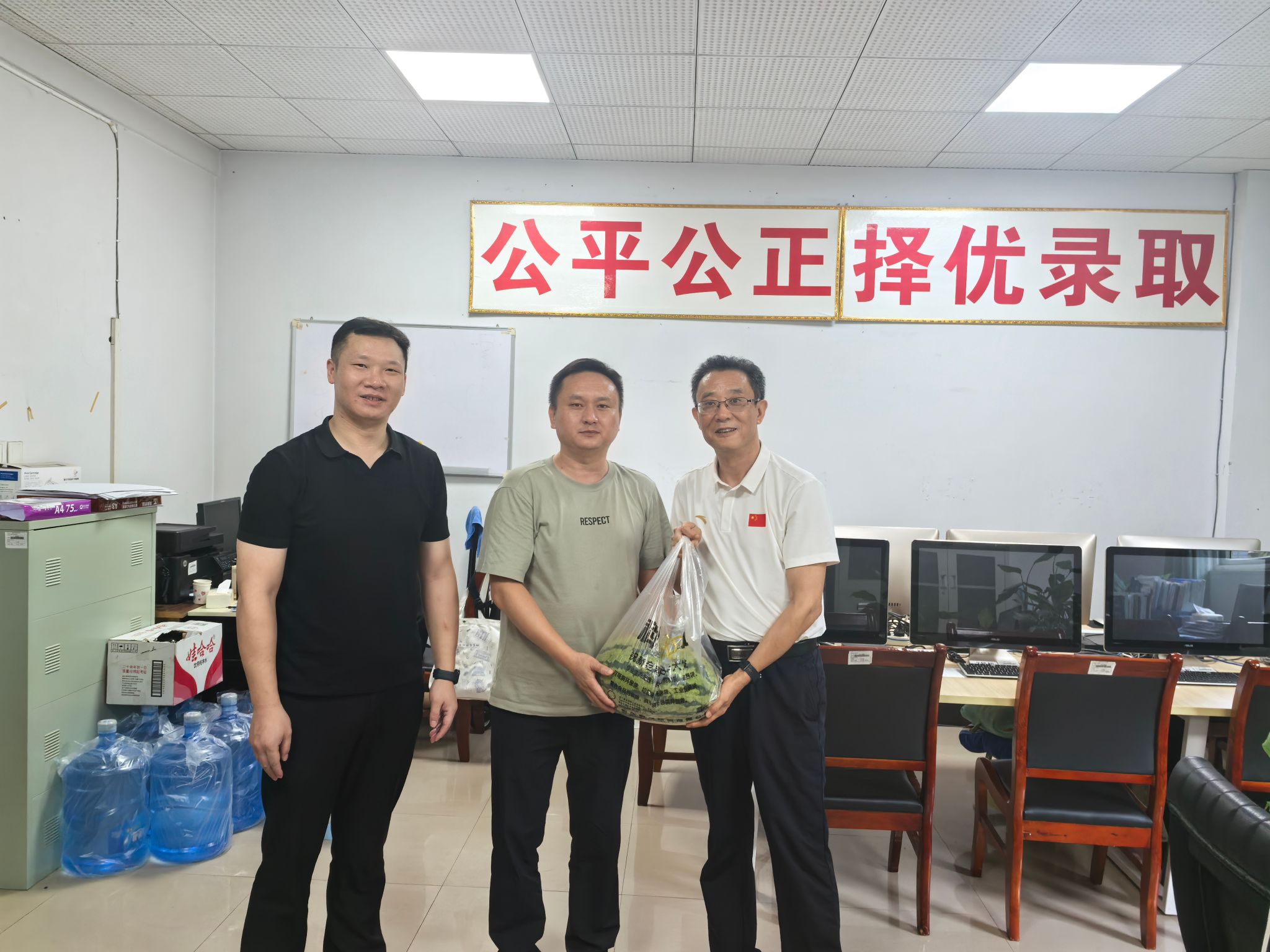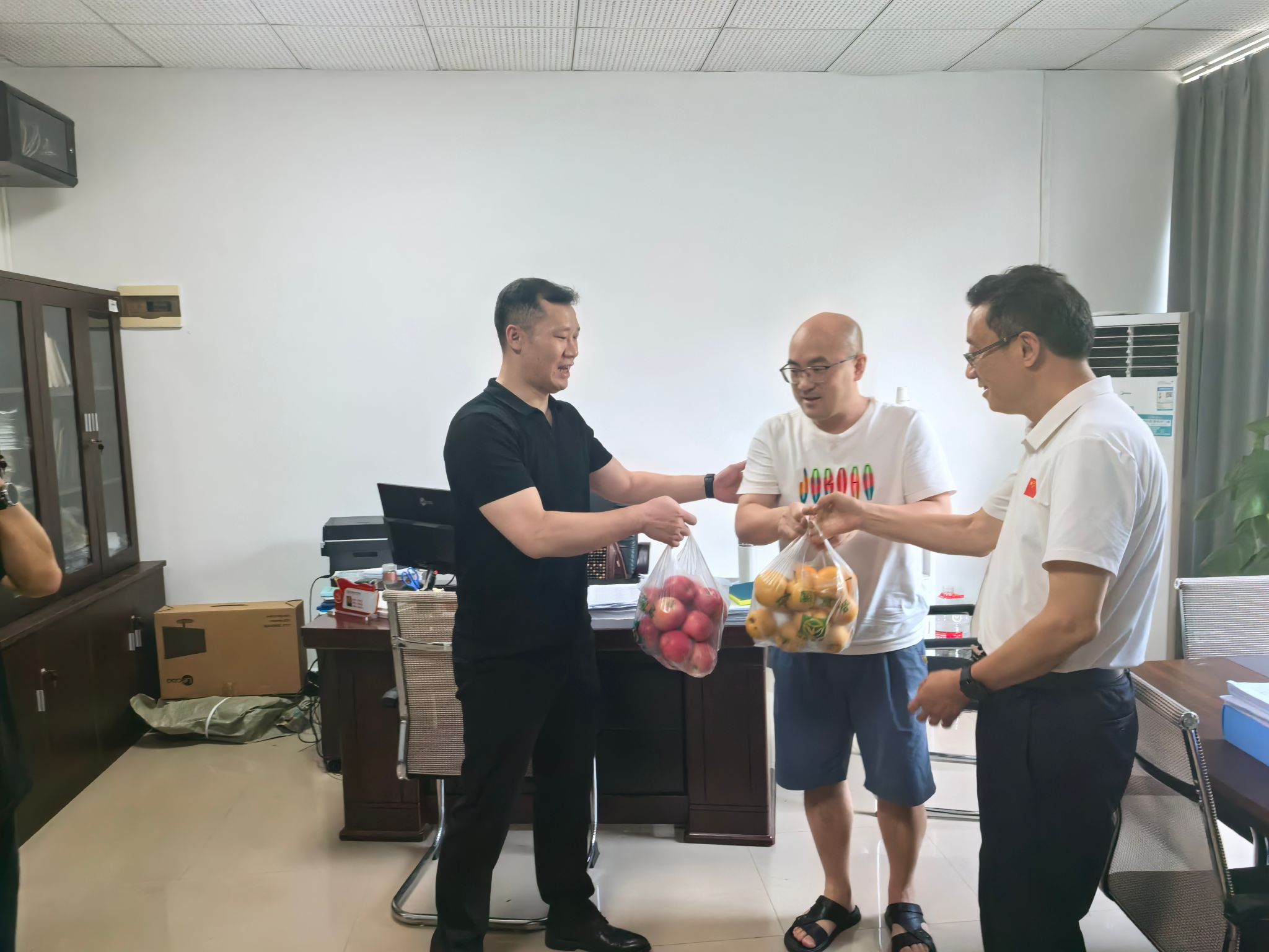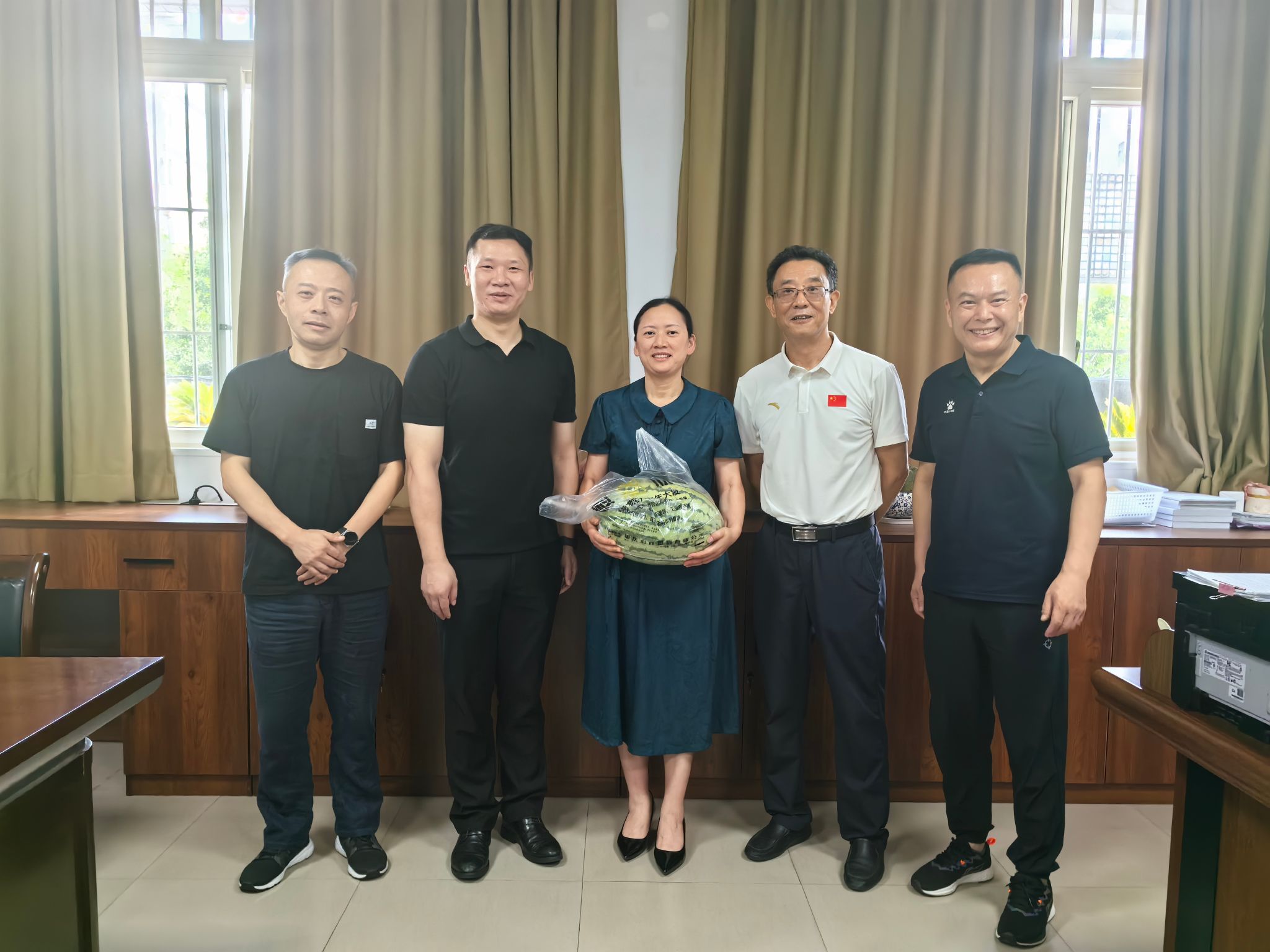 陈志军总经理一行先后到学校教务处、招生处、财务处、后勤管理处、保卫处走访慰问,与留校工作人员深入交谈,了解工作开展情况,并送上解暑西瓜和水果。